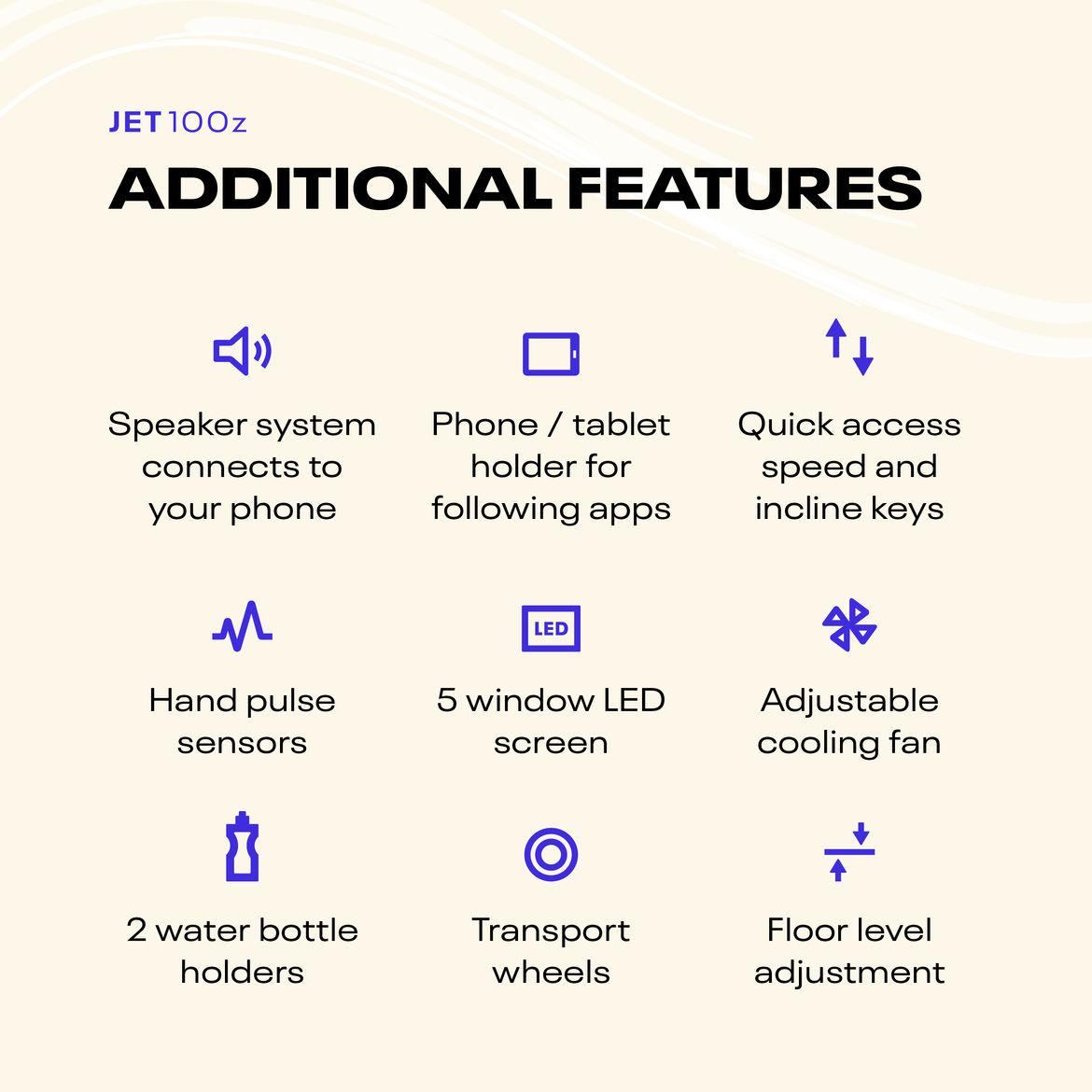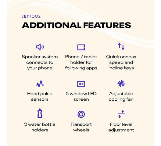 with 24 pre-installed fitness programs, a custom setting for you to design your own, and 3 target programs, the jet 100z has plenty of variation to help keep you motivated and ensure you can reach your fitness goals.