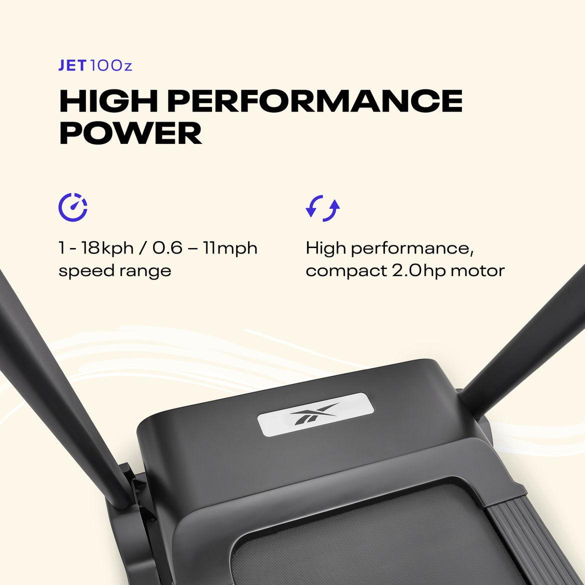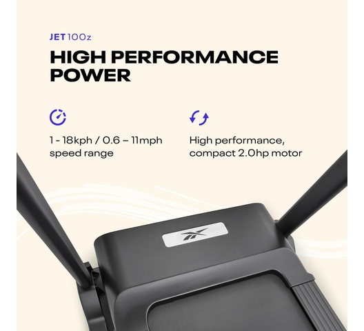 The reebok jet 100z treadmill is ideal for home cardio fitness thanks to its 2.0 hp motor, which delivers speeds of 0.6 – 11 mph across 12 levels of electronic incline.